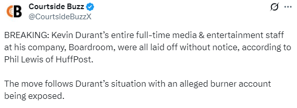 杜兰特的公司突然解雇全部全职编辑团队引热议,美媒Courtsde Buzz表示,这一举动似乎与杜兰特此前陷入的小号事件被曝光有关。