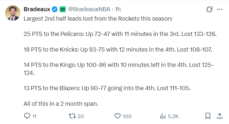 休媒晒出过去两个月内,火箭队已经有四次下半场领先至少13分的情况下被逆转了,最惨烈的一场是下半场领先鹈鹕25分却被逆转了。这场是领先尼克斯18分被逆转。