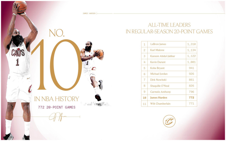 同时本场是哈登生涯第772次单场砍下20+得分表现,成功超越NBA名宿张伯伦升至历史第10,安东尼以796场排名第九,詹姆斯1310场位列历史第一。