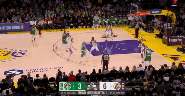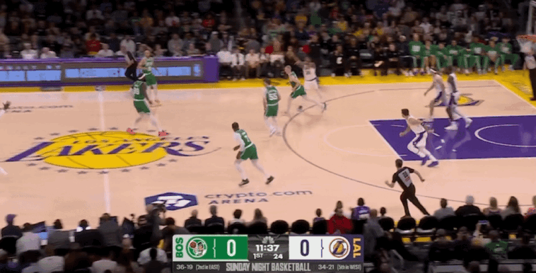 末节比赛开始,里夫斯突破抛投,武切维奇漂移投篮,詹姆斯和八村垒连续得分,普里查德连得6分回应。詹姆斯补篮得手,杰伦-布朗撤步跳投,东契奇突破上篮,普里查德和杰伦-布朗连续得分,凯尔特人打出一波8-0的进攻高潮,两队分差突破20大关。里夫斯急停跳投,普里查德三分命中击溃湖人。眼看两队分差始终在20分以上,湖人在比赛还剩下3分22秒换下全主力,提前宣告投降,比赛进入垃圾时间,最终湖人主场惨败凯尔特人。
