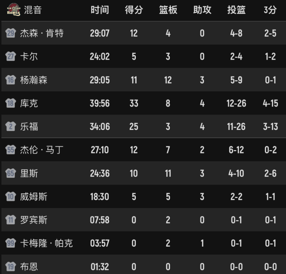 混音队的进攻效率开始下降,乐福只想着自己攻,不寻求配合,有点独啊,杨瀚森没有投篮出手机会。只剩2分多钟时,混音落后12分。杨瀚森摸不到球,乐福跟库克轮番单打。比赛最后时刻,杨瀚森补扣得分。混音队逆转失败,以113-118失利。