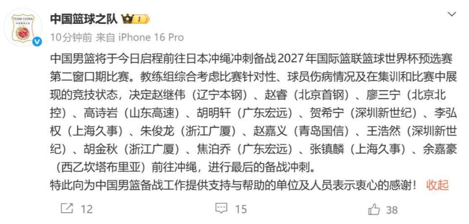 世预赛第二窗口期的比赛,中国男篮将先后对阵日本队和中国台北队,其中首战于2月26日客场挑战日本。日前,中国男篮已经从上海出发,飞往日本冲绳。中国篮球之队也公布了出征的球员名单,郭士强将带14人前往日本,赛前才会确认最终的12人大名单,这也与媒体人付政浩对郭指导严谨细腻风格的推测相吻合。