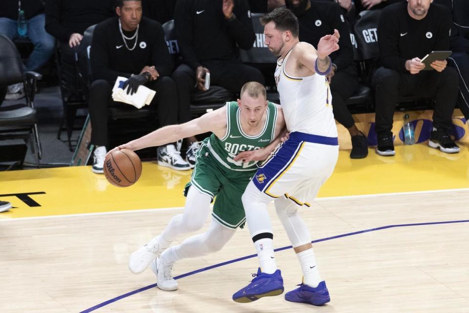 下半场易边再战,第三节布朗先进三分,老詹回敬一个,东契奇也来三分,布朗反击2+1,雷迪克又吃技术犯规,东契奇造进攻犯规,58-69进入暂停。回到比赛,东契奇和詹姆斯站出来连续得分,普里查德三分还有,布朗冲击造犯规,湖人挑战成功但又被对手轻松得分。湖人这边依靠罚球缩小分差,但布朗三分强投进了,三节结束凯尔特人84-71领先13分。