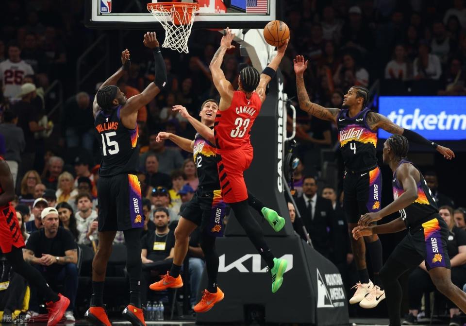 比赛开场仅1分钟,开拓者前锋德尼·阿夫迪亚便因腰部不适离场,给主队蒙上一层阴影。首节双方你来我往,打得十分胶着,场上比分交替上升。次节,两队争夺依旧激烈。开拓者队开始不断冲击内线取分,多诺万·克林根与杰拉米·格兰特联手打出一波9-0的攻势,帮助球队取得领先。太阳队不仅投篮手感不佳,失误也开始增多,半场结束时开拓者以7分优势领先。