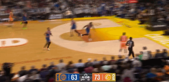 比赛刚刚开始,哈登便命中一记三分,随后哈登连续中投和远投不中,紧接着很快找回手感,连续在罚球线附近跳投得手,单节拿到7分3助攻。次节比赛中,哈登手感急速下降,单节5投仅有1中拿到2分。上半场结束,骑士队仅领先尼克斯队6分。