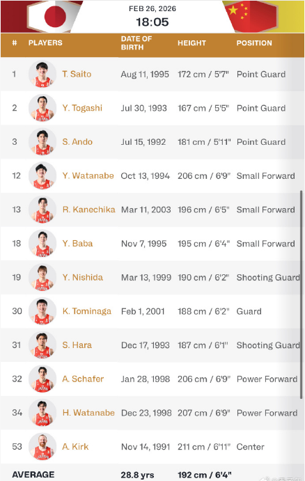 与此同时,日本男篮也公布了明日比赛的12人大名单:亚历克斯·科克、安藤誓哉、富坚勇树、原修太、渡边雄太、齐藤拓実、马场雄大、幸树、渡边飞勇、西田优大、富永启生、金近廉。