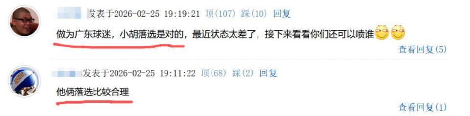 出征的14人当中,胡明轩、赵嘉义两人最终落选。对此,球迷直言:“作为广东球迷,小胡落选是对的”、“他俩落选比较合理”。