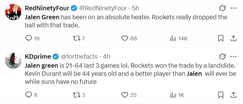 美媒:杰伦-格林过去三场比赛非常之低,哈哈。火箭队在这笔交易中获得成功,就算杜兰特年满44岁他也能比这个赛季的格林表现更好,太阳队毫无未来可言。