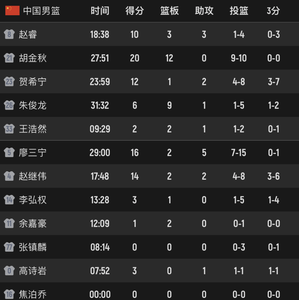 来看看本场数据,中国队多人表现出色,5人得分上双,发挥最好的球员没有疑问,当属胡金秋。大秋全场投篮10中9,拿下20分12篮板的两双数据,包括4个前场板,效率太稳定了,末节发挥突出,是中国队逆转的关键。对比周琦,还是胡金秋更加值得信赖。