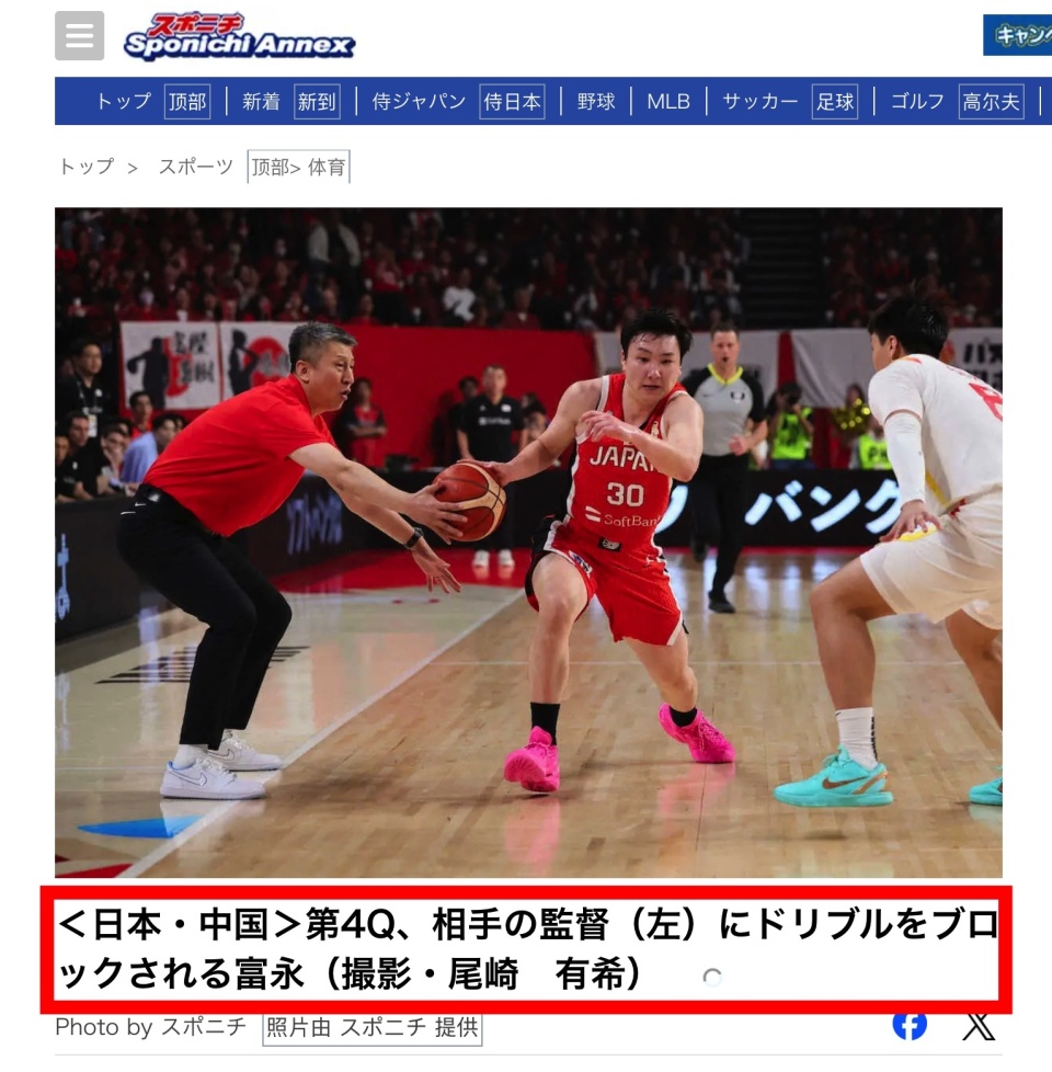 引起日本媒体大规模炒作的直接导火索,出现在第四节还剩7分多钟的最关键时刻。当时中国男篮仅以2分的微弱优势领先,日本队外线核心、被当地球迷戏称为日本库里的富永启生在右侧持球强行突破。中国队后卫赵睿追防不及失位,眼看对手就要杀入内线形成直接得分威胁。就在这电光火石的一瞬间,站在场边激情指挥的郭士强指导做出了一个惊人举动,他直接越界出手果断破坏了富永启生的运球路线。令人啼笑皆非的是,站在后方的裁判第一时间竟然毫不犹豫地将球权判给了中国队。富永启生当即暴跳如雷,向裁判疯狂抗议施压,随后裁判组经过紧急商议后才将原本的判罚改了回来。这一幕成为日媒赛后疯狂输出的绝佳素材。(来源@sponichi @日本雅虎体育 文章末尾有gif动图)