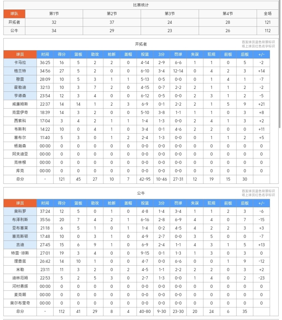 第二节格兰特与替补席的克雷伊奇大爆发,虽然克林根没有出战,但是杨瀚森依旧牢牢的坐在替补席,在比赛的轮转阶段,我们还是没有等来杨瀚森出场的机会,场面上开拓者打得还不错,他们单节轰出37-29的比分,中场休息时,开拓者69-63领先公牛,格兰特半场得到16分2板1助、克雷伊奇11分2板1助、卡马拉10分3板1助、亨德森10分1板1助、威廉姆斯6分6板1助、穆雷6分2板1助、霍勒迪4分1板2助、塞布尔3分2板2帽、韦斯利3分3助、西索科1板1助!