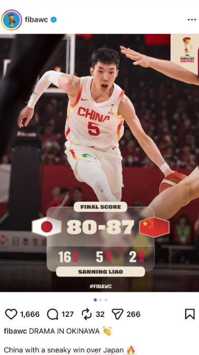 赛后,FIBA官方在社媒上发布本场比赛赛果,并配文:“a sneaky win”。而“sneaky win”往往被形容为出乎意料的胜利。