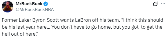 湖人名宿拜伦-斯科特希望勒布朗-詹姆斯结束在湖人的生涯,斯科特表示:我是詹姆斯的球迷,但你也知道,我说话从不拐弯抹角,我的意思是,我认为这赛季应该是他在湖人的最后一年了,我不是说在NBA的最后一年,只是在这里。你没必要非得退役回家,但你必须得离开这里了,你知道,这是到时候了,你懂我意思吧,是时候该离开了。