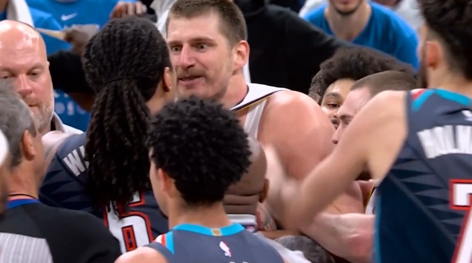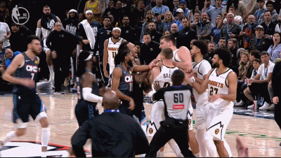 然而比赛这个时候风云突变。由于在回防的时候被多尔特绊倒,约基奇非常愤怒冲着多尔特有一个类似挥拳的动作,此外他还和杰林互喷垃圾话。随后双方爆发冲突,双方多位工作人员集体才把两人拉开。多尔特二级恶犯直接被驱逐,约基奇和杰林吃到技术犯规。