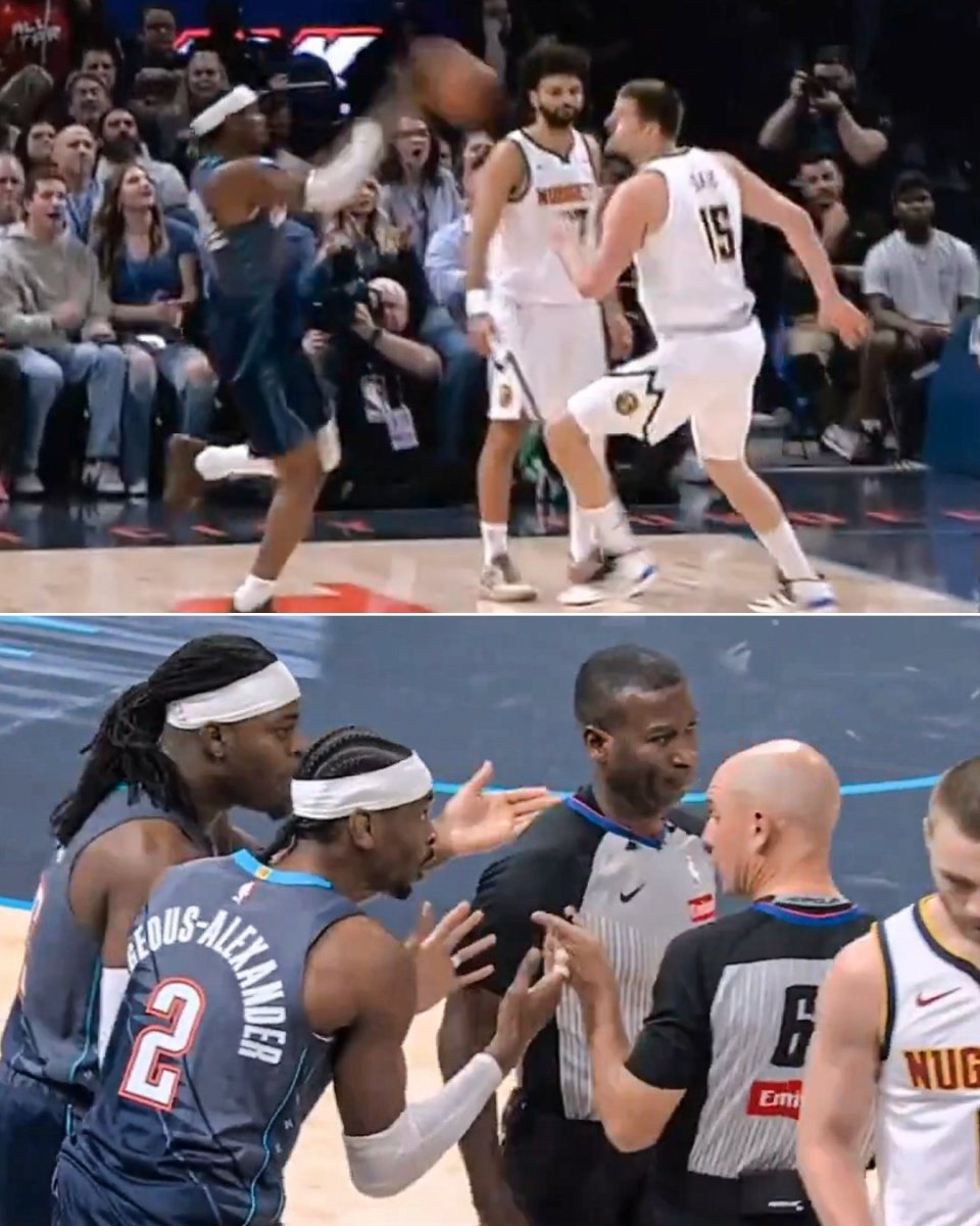 期间亚历山大持球强突造成约基奇犯规,随后他拿球砸约基奇,两人同时向裁判抱怨,最终裁判追加吹罚亚历山大技术犯规。