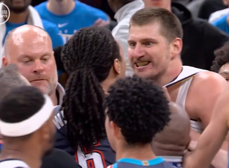 穆雷三分止血后,约基奇打板抛投,霍姆格伦连续吃饼暴扣,约基奇今天可没罚球,还是亚历山大“强”。两队维持8分左右陷入拉锯战,中段约基奇和亚历山大对飙,约基奇带队拉开10分分差。后半段穆雷再中三分,亚历山大连续单打,三节打完时,雷霆追到77-83。决战第四节,雷霆这边下三分雨,多特和杰林多点开花,一波11-2反超掘金。此时发生意外:多特发力直接撞翻约基奇,约基奇在第四翻滚几圈后,起身暴怒,准备和多特打架。杰林冲上来撕扯约基奇球衣,约基奇又和雷霆球员扭打到一起,场面陷入混乱!