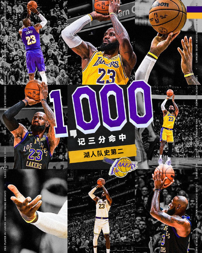 41岁的詹姆斯宝刀不老,他达成湖人生涯1000记三分里程碑,成为湖人队史第二人,仅次于科比命中1827记三分。