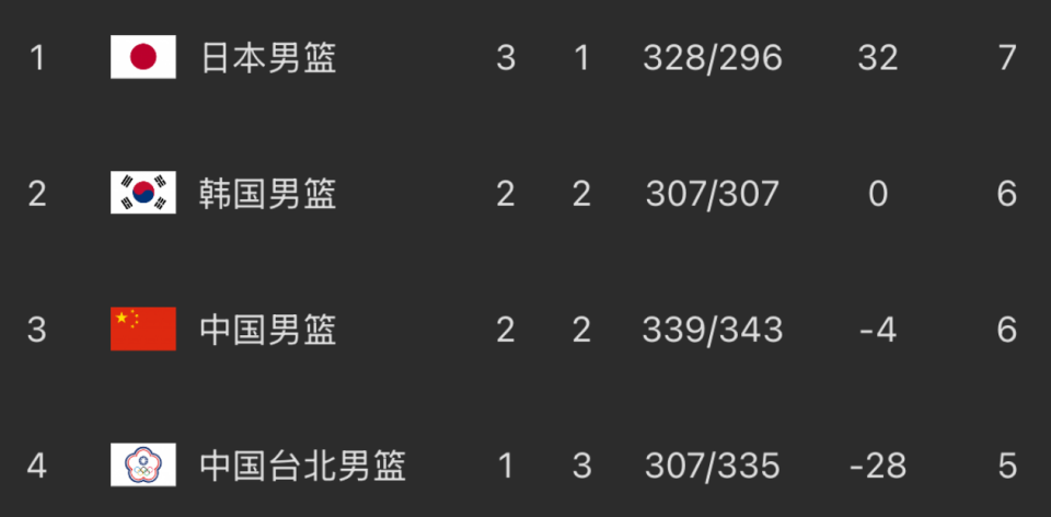 本轮战罢,在小组积分榜上,日本队3胜1负积7分排名第1,中国男篮跟韩国男篮同为2胜2负积6分,中国队净胜分处于劣势,排名第3。中国台北队1胜3负积5分,位列垫底位置。