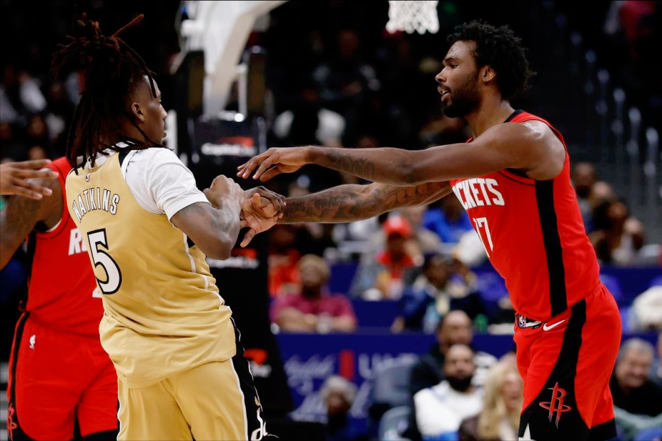 然后是阿门,真的别再让他练控卫了,再练下去,感觉都要把他练废了。这场比赛开场的时候,他仍然在担当控卫的角色,看得出来,他完全游离于火箭的进攻体系之外,打得很挣扎。