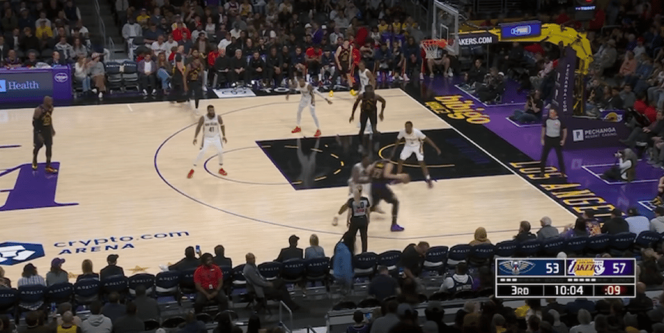 末节比赛开始,拉拉维亚空切上篮,詹姆斯2罚1中,萨迪克-贝和穆雷连续三分命中。斯马特抛投得手,麦克格温斯突破得手,艾顿跳投打进2+1,鹈鹕球员连续走上罚球线5罚4中。鹈鹕打出一波7-0的进攻高潮,海斯扣篮止损,里夫斯三分命中,湖人打出一波14-0的进攻高潮扭转局势。鹈鹕超过4分钟一分不得,锡安连续上篮得手打破僵局,东契奇2罚全中,斯马特三分命中。锡安错失追分投篮,东契奇三分命中,湖人取得双位数领先优势。穆雷打进2+1,里夫斯2罚全中,穆雷和墨菲连续错失追分投篮,鹈鹕大势已去,最终湖人成功逆转击败鹈鹕。