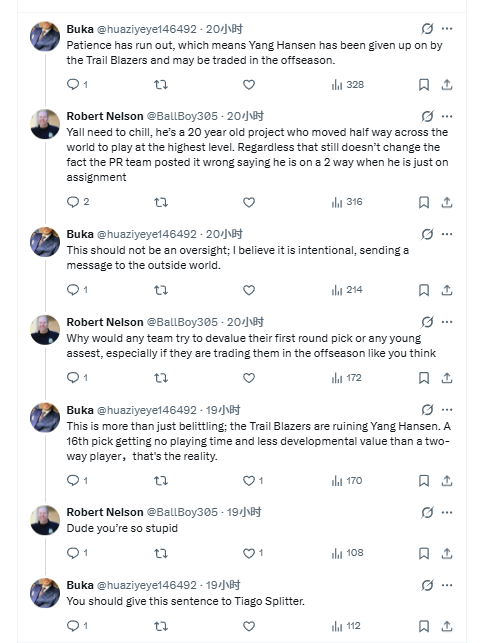 开拓者官方的错误,很快被一位名为Nelson的球迷指出,他写道:“杨瀚森是下放发展联盟,而不是发展联盟双向合同。”随后,一位Buka的球迷与Nelson在评论区展开热议。