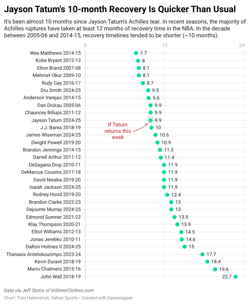 放在现代NBA,这依然是极快的回归速度。不到10个月复出,将是2015–16赛季鲁迪-盖伊(不到9个月)之后,首发球员里最快的跟腱回归。
