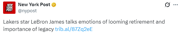 《纽约邮报》还报道,据我们所知,詹姆斯可能会在本赛季结束后退役,他正在为生涯结束做好准备。上个月在克利夫兰,他在观看致敬视频时落泪了,他职业生涯有11个赛季在那里度过,并在2016年带领骑士赢得了队史首个也是唯一一个总冠军。上周末,他带着女儿朱莉进行了首次父女客场之旅。
