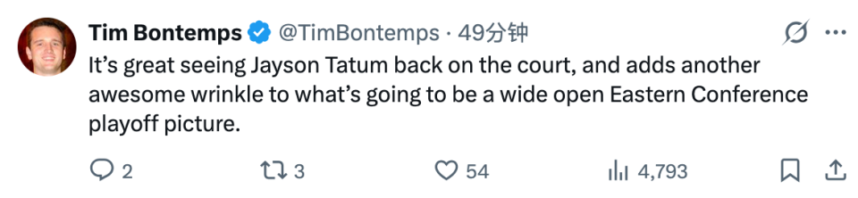 著名记者Tim Bontemps说道:“看到杰森-塔图姆重返赛场真是太好了,这给竞争激烈的东部季后赛又增添了一层变数。”