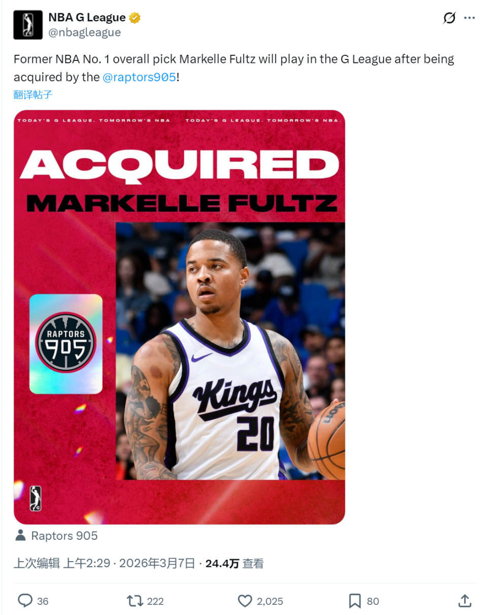 北京时间3月7日上午,NBA发展联盟官宣:多伦多猛龙下属的猛龙905队,签约前NBA状元秀马克尔-富尔茨。本赛季富尔茨将征战发展联盟,并寻求机会重返NBA。2024-25赛季,富尔茨曾在国王队效力,本赛季一直是自由球员。