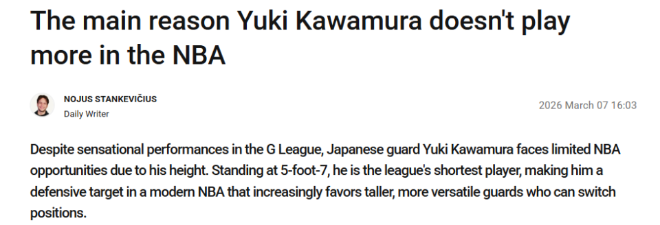 北京时间3月8日,欧洲篮球专家Stankevicius撰文提及河村勇辉,他表示,尽管在G联赛(发展联盟)打出了轰动性的表现,这位日本后卫在NBA仍面临有限的出场机会,根源还是在于他的身高。