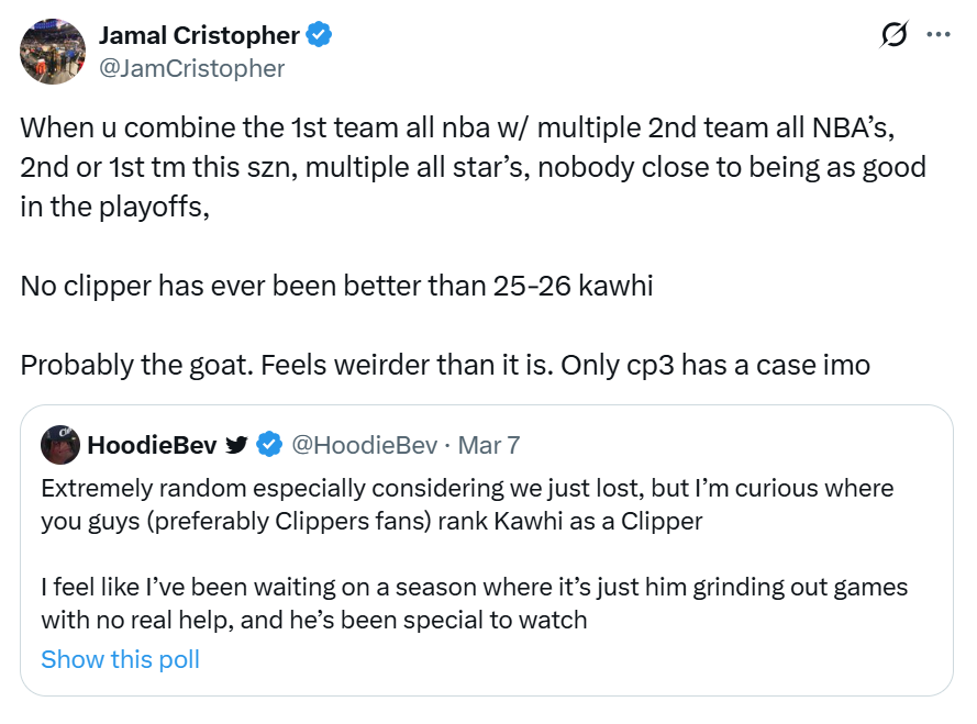 快船队记Jamal Cristopher就称赞到:“小卡曾多次入选一阵、二阵,本赛季同样有望入选,加上多次全明星与季后赛出色的表现,快船队史没有哪个球员能够比得上本赛季的小卡。”