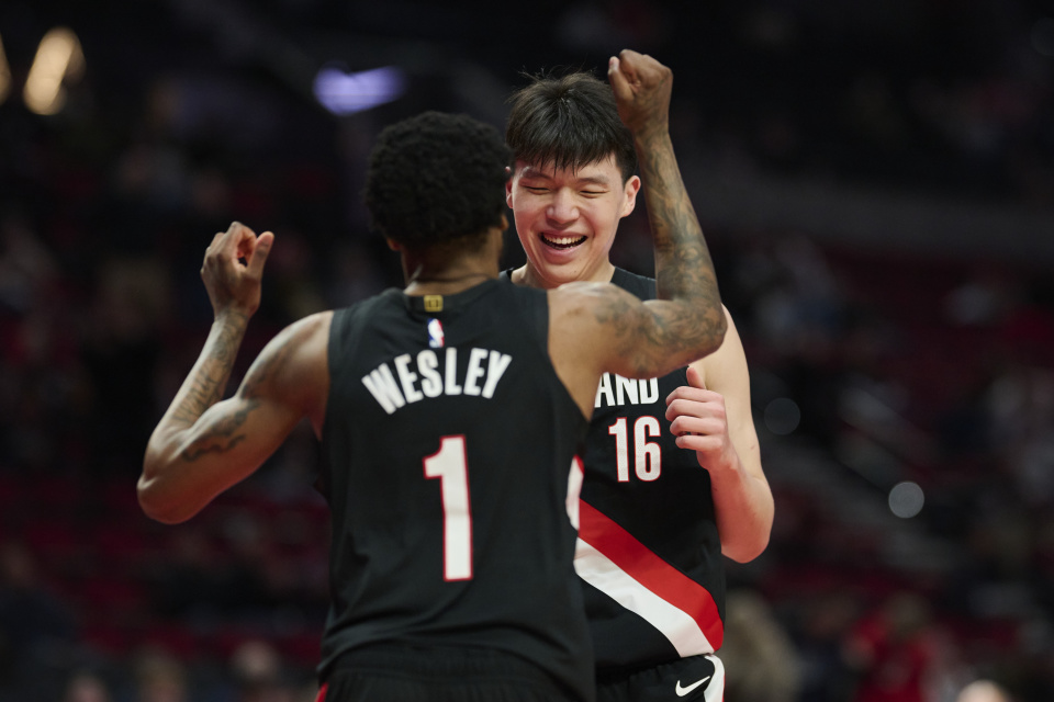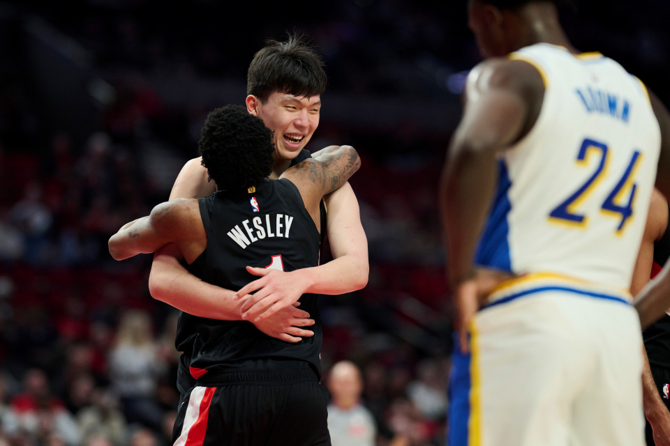 杨瀚森扣篮完成后,开拓者全场沸腾,主场球迷炸了锅,主场的DJ也嗨了,直接用中文一个字一个字地说:杨瀚森暴扣!小杨在波特兰球迷面前,牌面直接拉满。精彩还没完,韦斯利这一球突破后倒地,三四个队友过来拉他,暴扣板凳席的队友,全部过来庆祝,小杨也过去拉他,起身之后,韦斯利又来了一波庆祝,先是在底线附近跳舞,然后冲过来跟小杨贴胸庆祝,小杨被搞懵了,不知道是要起跳撞胸,还是撞肩,还是握手,最后小杨干脆来了一个爱的抱抱,两人都乐开了花。