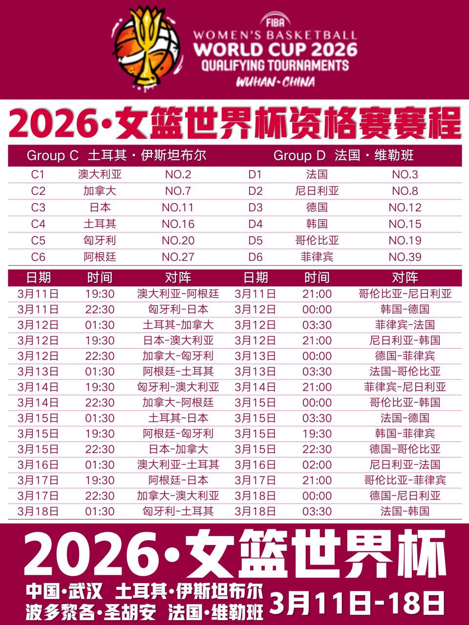 3月11日至18日,2026年女篮世界杯资格赛将在全球四大赛区同步打响。作为上届世界杯亚军、目前世界排名第四的中国女篮,将在主场武汉赛区开启冲击柏林世界杯的征程。由李月汝、韩旭领衔,加之18岁新星张子宇首次亮相成年组国际赛事,中国女篮此次的目标不仅是稳稳拿下正赛名额,更希望通过实战磨合阵容、提升外线实力,为9月柏林世界杯蓄力。