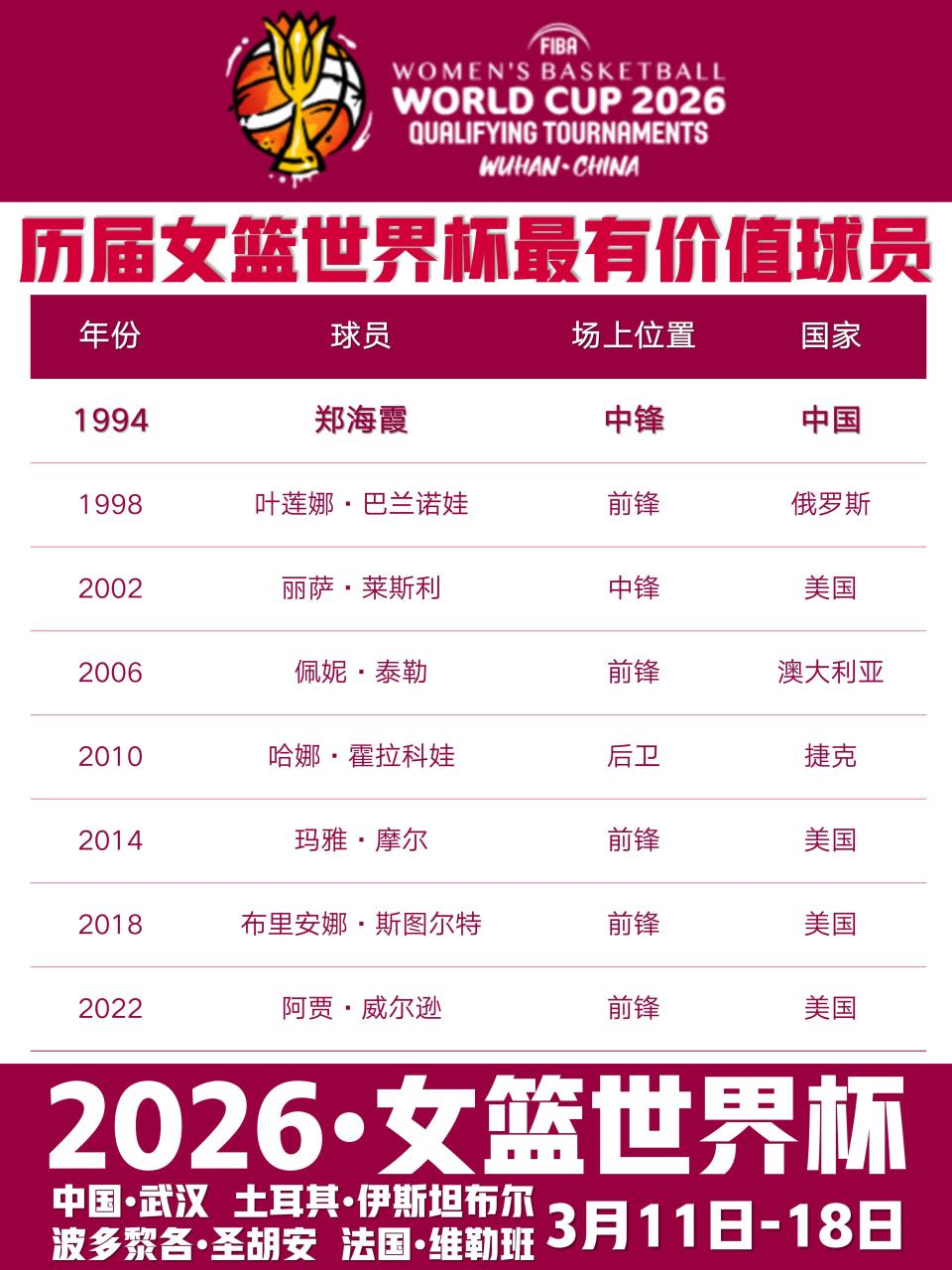 回顾中国女篮的世界杯历史战绩,球队曾在1994和2022年两次夺得亚军,1983年获得季军。1994年,郑海霞荣膺世界杯最有价值球员,成为中国女篮历史上的标志性人物。如今,这支拥有豪华内线配置的新一代中国女篮,正试图在柏林续写辉煌。