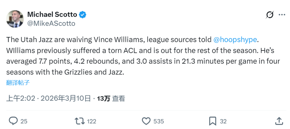 北京时间3月10日,据NBA名记Michael Scotto报道,爵士已经裁掉后卫小文斯-威廉姆斯。爵士目前内线人手短缺,凯斯勒、努尔基奇和小贾伦-杰克逊均已赛季报销,班巴正在执行第二份10天短合同,爵士腾出名额能够转正班巴。