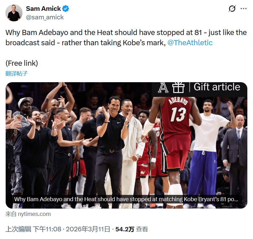 著名记者Sam Amick表示,出于对科比的尊重,热火应该换下阿德巴约,而不是看着他拿到83分。 Amick写道:"出于人性使然,科比的离世让每一个他最珍贵的成就都变得更加厚重,也让人们觉得应当以某种特别的方式来对待这些成就。而阿德巴约砍下高分后,我与一些科比的前同事联系过后得到的反馈,有这种想法的人不止我一个。当然,他无需为此道歉。恰恰相反,完成如此不可思议的壮举理应赢得四面八方的赞誉;毕竟83分就是83分。要是他能早些收手就好了。”