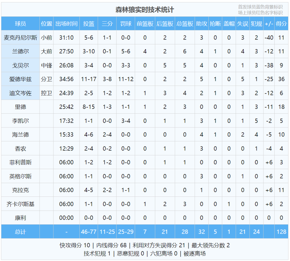 伦纳德此役20投15中,三分9中6,罚球10中9,狂砍45分5篮板5助攻2抢断1失误,正负值+41全场最高。最近两次跟森林狼交手,面对联盟顶级防守球员麦克丹尼尔斯,伦纳德场均43分6.5篮板3.5助攻3抢断,投篮命中率58%。