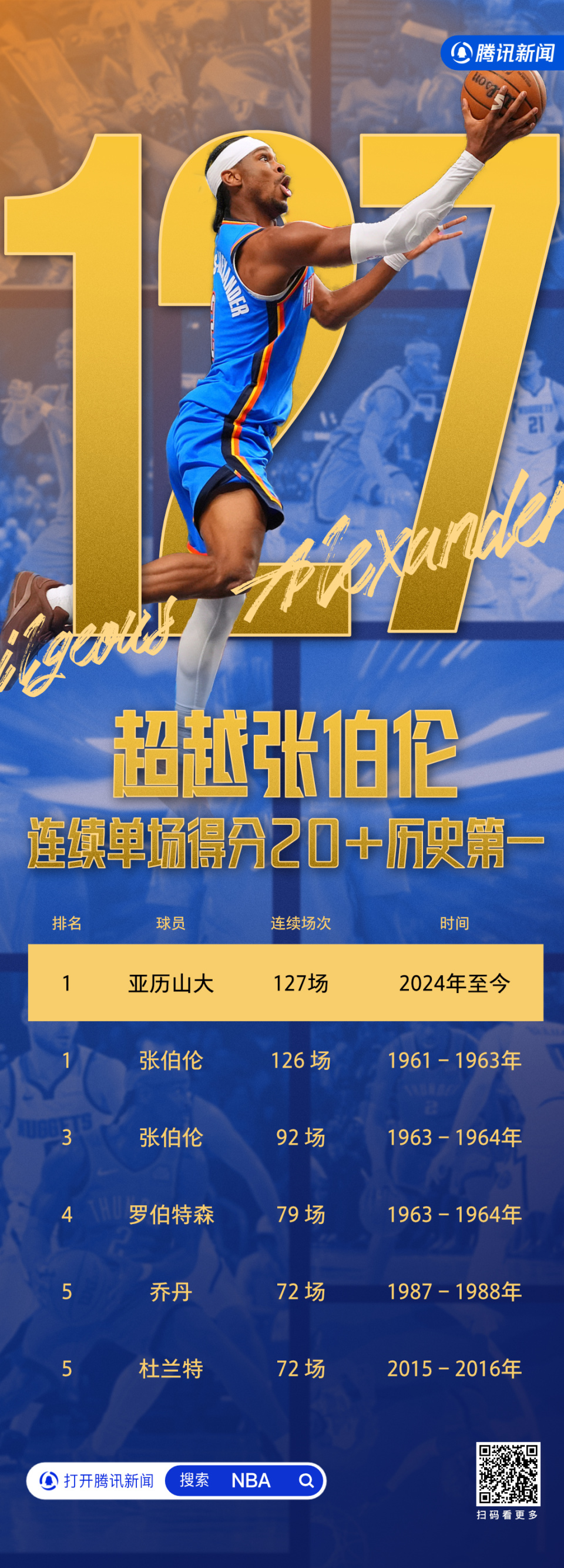 亚历山大连续127场得分20+,超越张伯伦保持63年的纪录,正式超越独占NBA历史第一纪录。