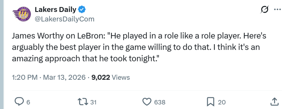 湖人名宿沃西赛后更是一针见血的表示:“詹姆斯打得像一个角色球员一样,作为联盟中最出色的球员之一,却愿意接受这样的改变,我认为他今晚的态度真的非常了不起。”