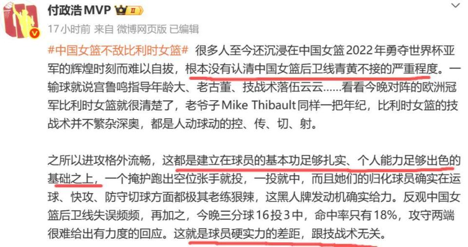 媒体人付政浩便一针见血地指出:“很多人还沉浸在世界杯亚军的辉煌,没认清后卫线青黄不接。”本场对阵比利时,面对这支欧洲顶尖强队,宫鲁鸣新带的后卫线陈玉婕、王佳琦和张曼曼,都很难匹配上对方的火力。