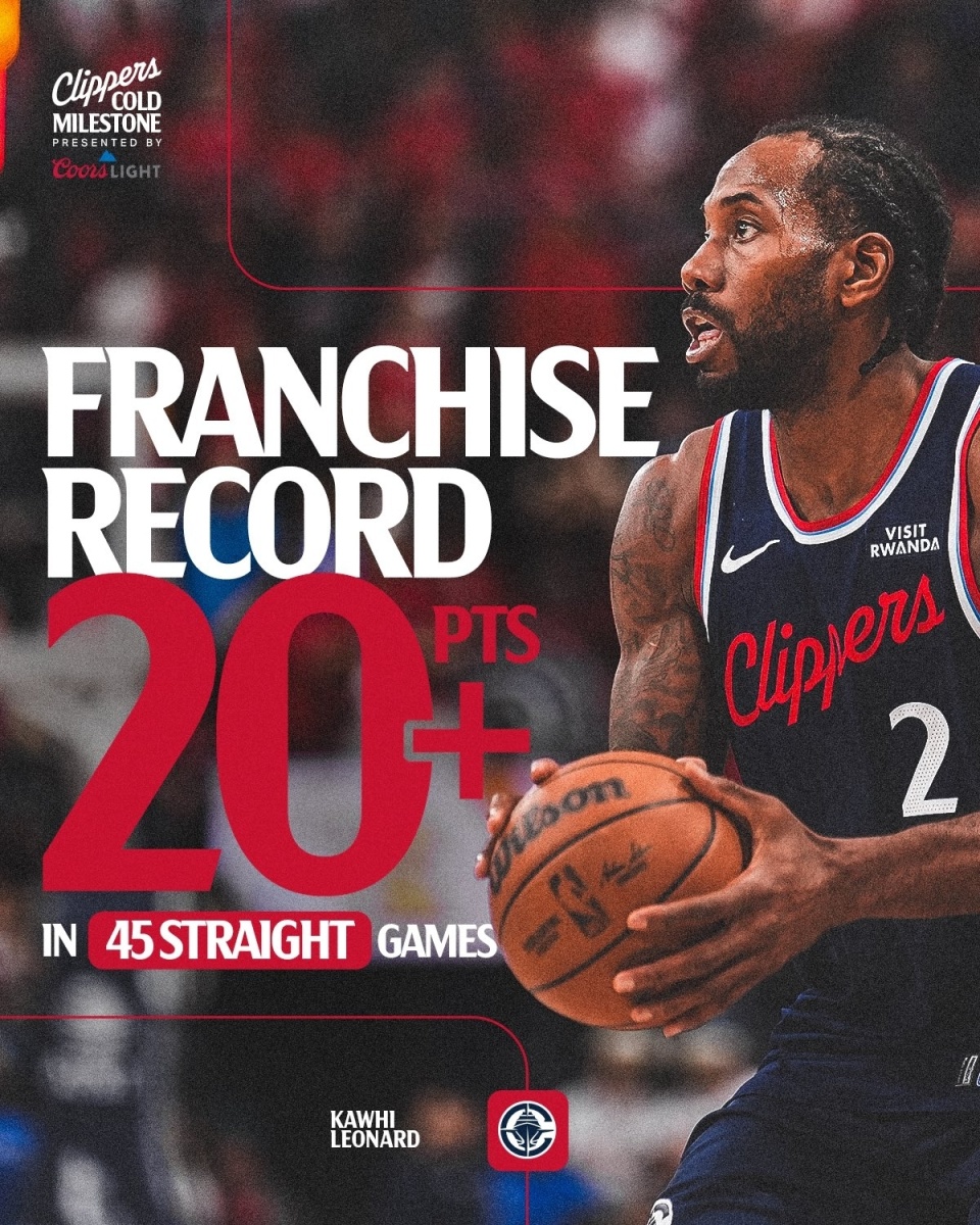 全场小卡出战26分钟,23中13,依旧高效砍下31分6板2抢断,连续第45场轰下20+得分表现,超越1974-75赛季的鲍勃-麦卡杜独占快船队史第一。