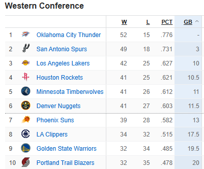 狂野西部!西部3-6名湖人、火箭、森林狼、掘金各差0.5胜场