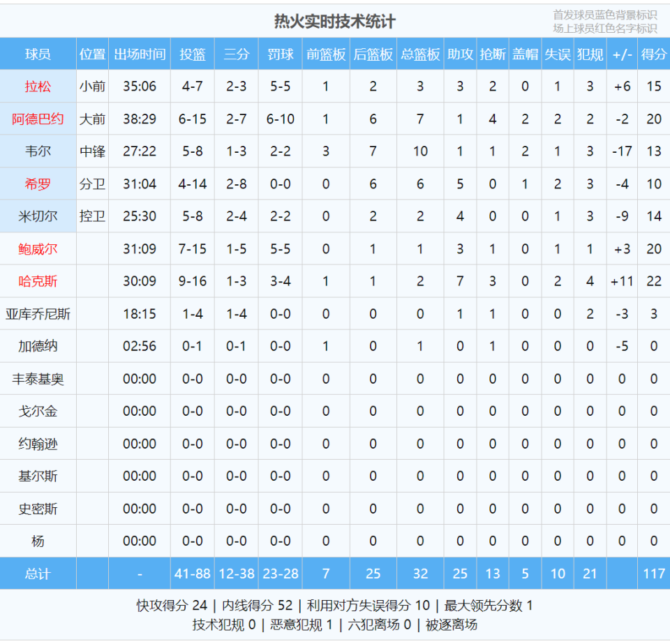 热火这边,鲍威尔本场复出被贬为替补,今天投篮15中7,三分5中1,罚球5中5,拿到20分3助攻,正负值+3。阿德巴约表现平平,投篮15中6,三分6中2,罚球10中6,得到20分7篮板1助攻4抢断2盖帽2失误2犯规,正负值-2。