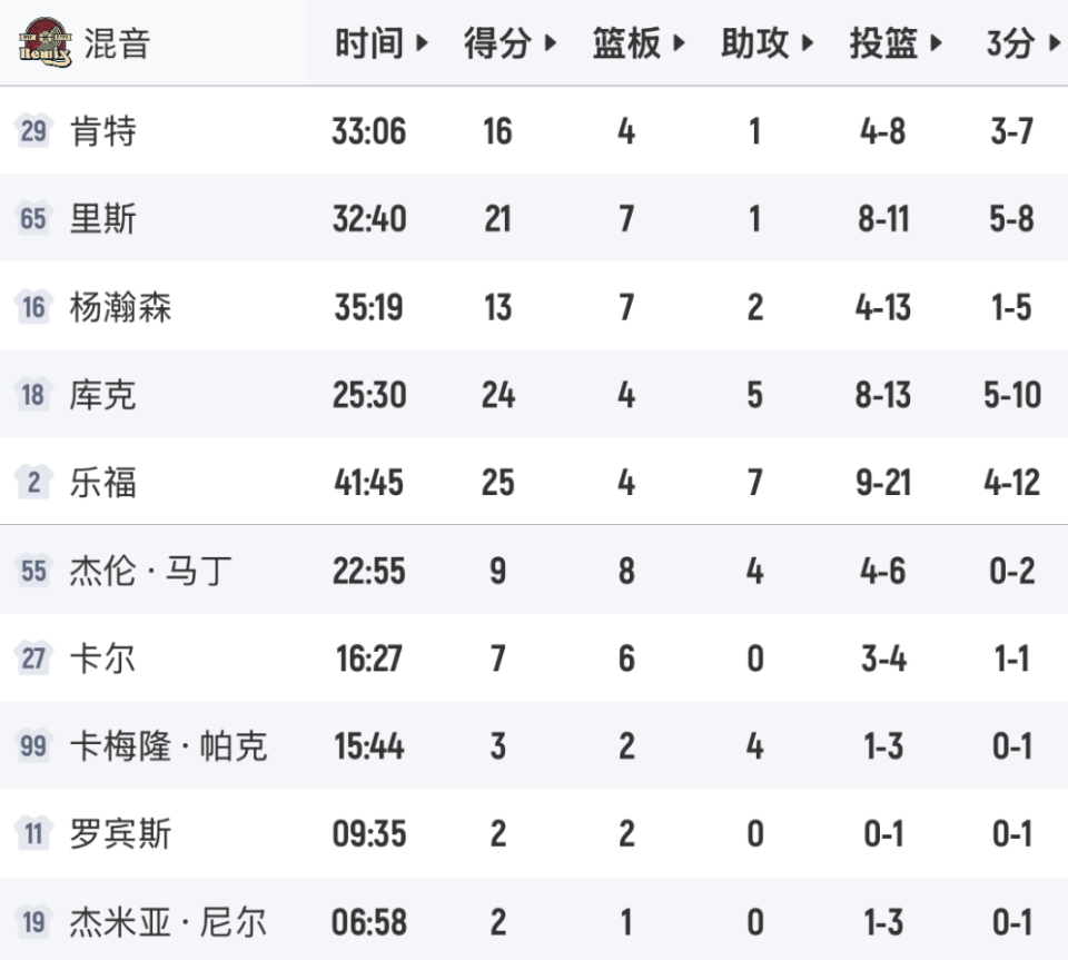 另外,乐福的存在也影响了杨瀚森的表现。此前与圣迭戈快船的2场比赛,杨瀚森分别贡献31分8板3助1抢断1盖帽(16投14中),以及16分13板2助攻1盖帽,表现很给力。当时乐福均不在场,混音队确立杨瀚森为核心,在内线持球攻,展示背身勾手绝活,打出信心了。再看看这场与湖人的比赛,乐福打了接近42分钟,21投9中,得到25分4板7助,乐福各种单打,持球时间太长了,杨瀚森成为球队配角,在三分线外等球。