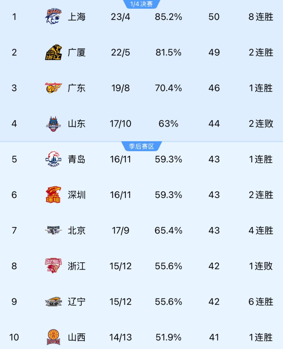 CBA一夜3场惨败!上海+广厦都赢球,辽宁6连胜,最新积分:北京第7