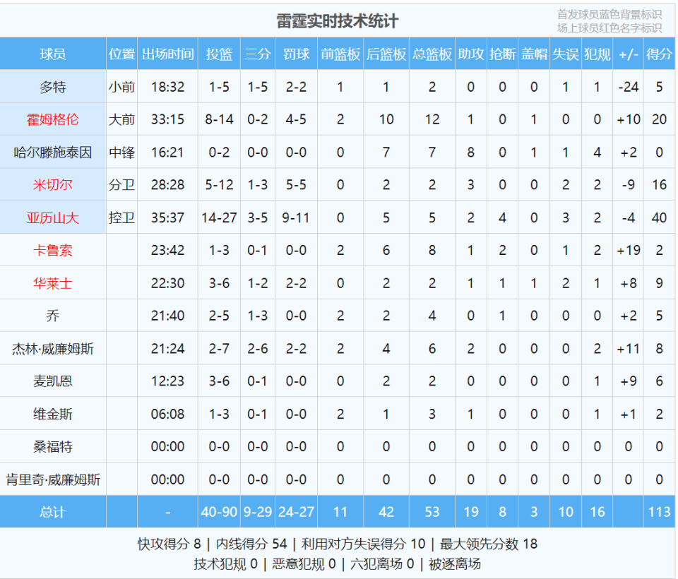 自2010年以来,雷霆13次打进季后赛,同期联盟第二多,仅次于凯尔特人的15次。雷霆二当家杰伦-威廉姆斯因伤继续休战,亚历山大出战35分钟,投篮27中14,三分5中3,罚球11中9,狂砍40分5篮板2助攻4抢断,正负值-4。
