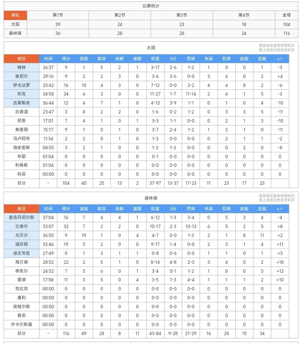 开场两队就陷入了对攻战,伊戈达罗和布克两人在进攻端很活跃,杰伦格林开启打铁模式,浪费了很多进攻机会,奥尼尔表现还可以,吉莱斯皮也是个人输出不行,森林狼队兰德尔、海兰德麦克丹尼尔斯三人打得相当不错,他们是森林狼咬住比赛的关键,首节太阳气势很足,不过森林狼针锋相对,太阳39-36领先3分,第二节森林狼队继续多点开花,太阳队杰伦格林还是不准,布克外线的三分效率也不高,中场休息时,太阳队63-64落后1分!