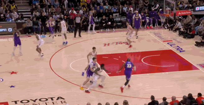 其中第一记空接尤其震撼:斯马特的传球偏得离谱,眼看就要飞出底线。但詹姆斯腾空而起,将球揽入怀中,狠狠砸进篮筐。不管对哪个年龄段的球员,这都是一记史诗级五佳球。