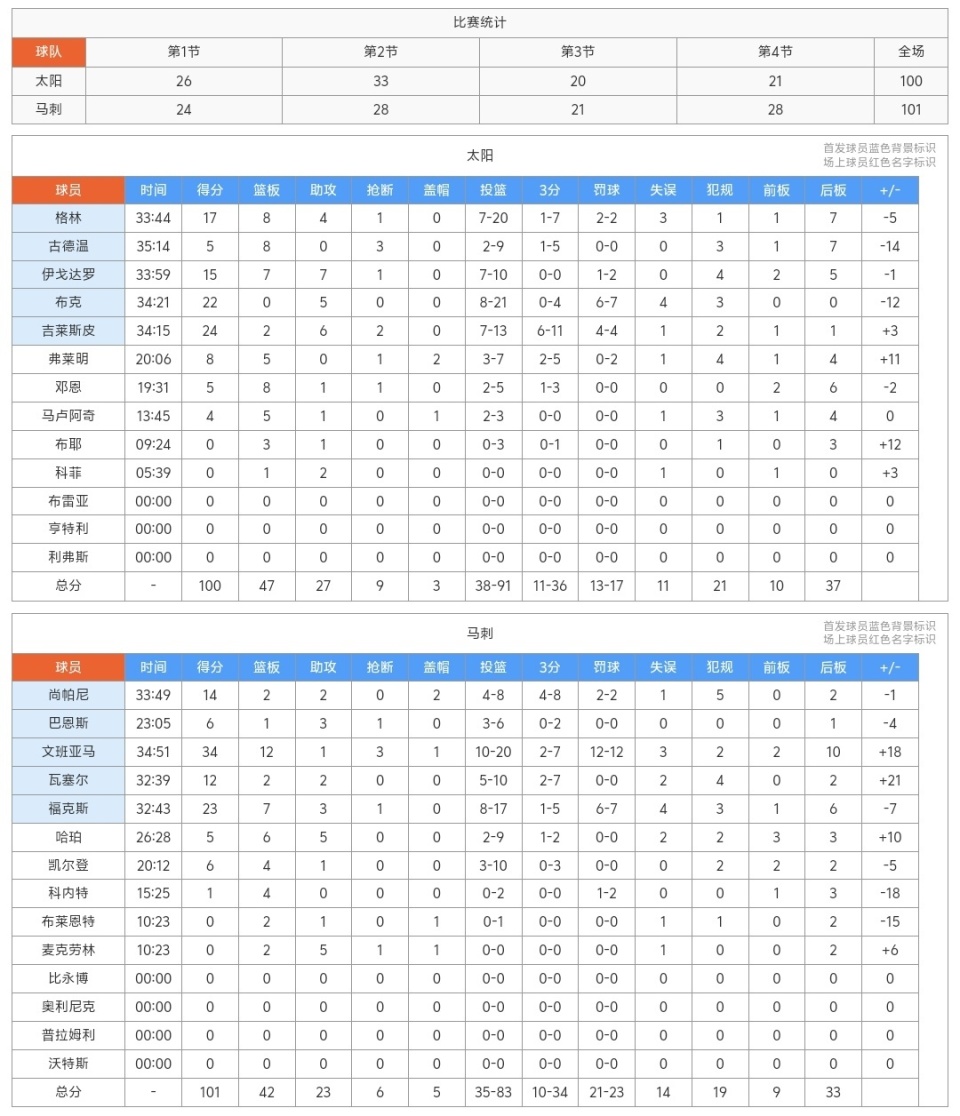 上半场太阳队吉莱斯皮17分3助、格林13分6板2助、伊戈达罗9分2板3助、布克6分2助、邓恩5分4板1助攻!