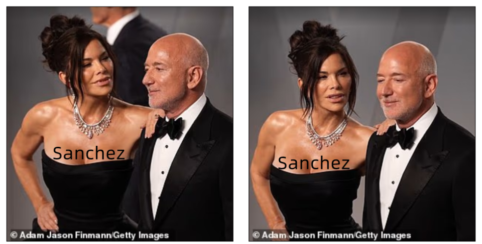 56岁的桑切斯身穿无肩带黑色礼服,62 岁的贝索斯同样一身黑色装扮,但两人看上去却有些貌合神离。